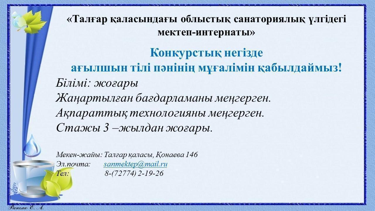 Конкурстық негізде ағылшын тілі пәнінің мұғалімін қабылдаймыз! » Талғар қаласындағы облыстық мектеп-интернаты