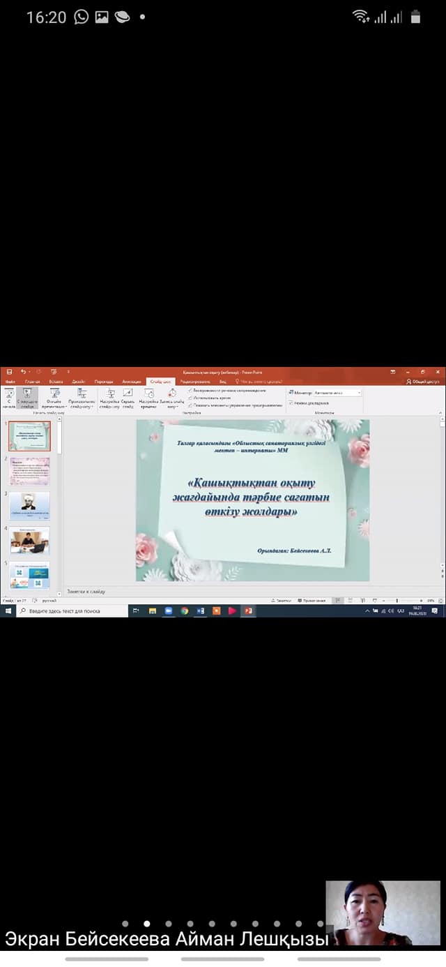 19 тамыз күні Облыстық білім беруді дамыту оқу-әдістемелік орталығының ұйымдастыруымен өткен ""Түзете- дамыта оқыту мен тәрбиелеудің ерекшеліктері" тақырыбында өткен семинарға Облыстық санаториялық үлгідегі мектеп-интернат тәрбиешісі Бейсекеева Айман Лешқызы қатысып, өз іс- тәжірибесімен бөлісті.