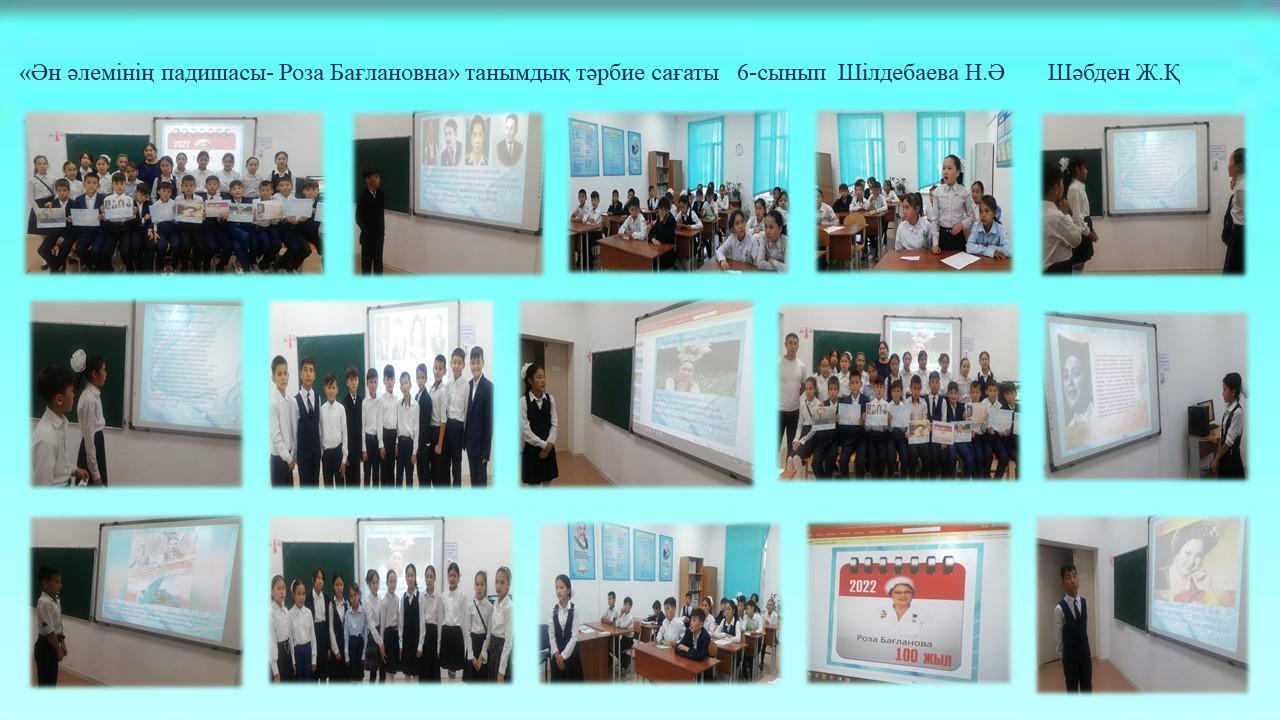 04 қазан 2022 0 1 2 3 4 5 «Ән әлемінің падишасы- Роза Бағлановна» танымдық тәрбие сағаты 6-сынып Шілдебаева Н.Ә Шәбден Ж.Қ