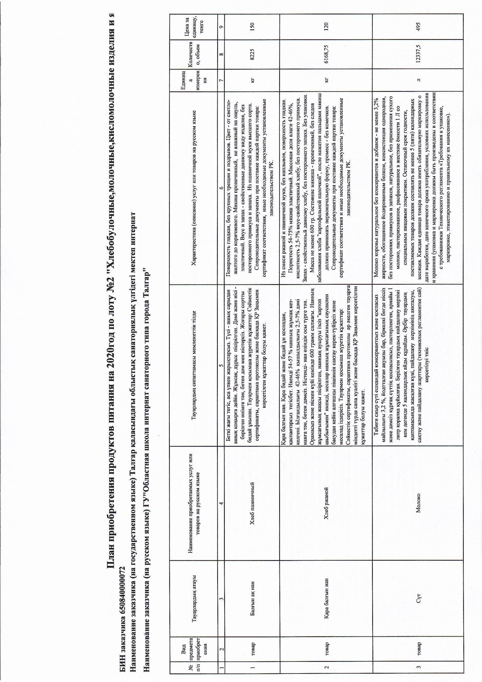 План приобретения товаров на 2020 год по лоту №2 » Талғар қаласындағы облыстық мектеп-интернаты